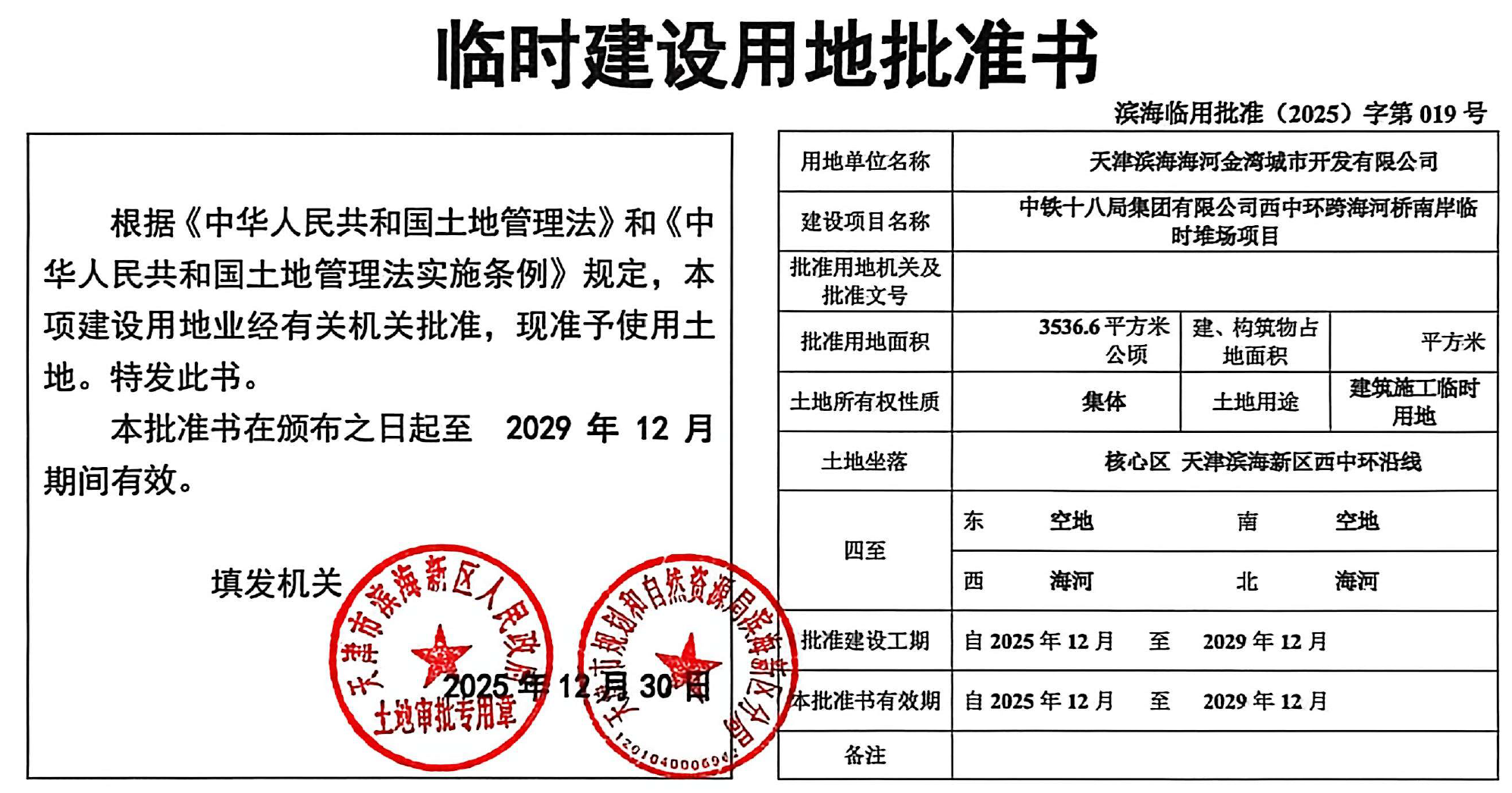 依据《欧博登录入口关于规范临时用地管理的通知》及《天津市临时用地管理办法》的有关要求,现将中铁十八局集团有限公司西中环跨海河桥南岸临时堆场项目临时建设用地批准书进行公告。